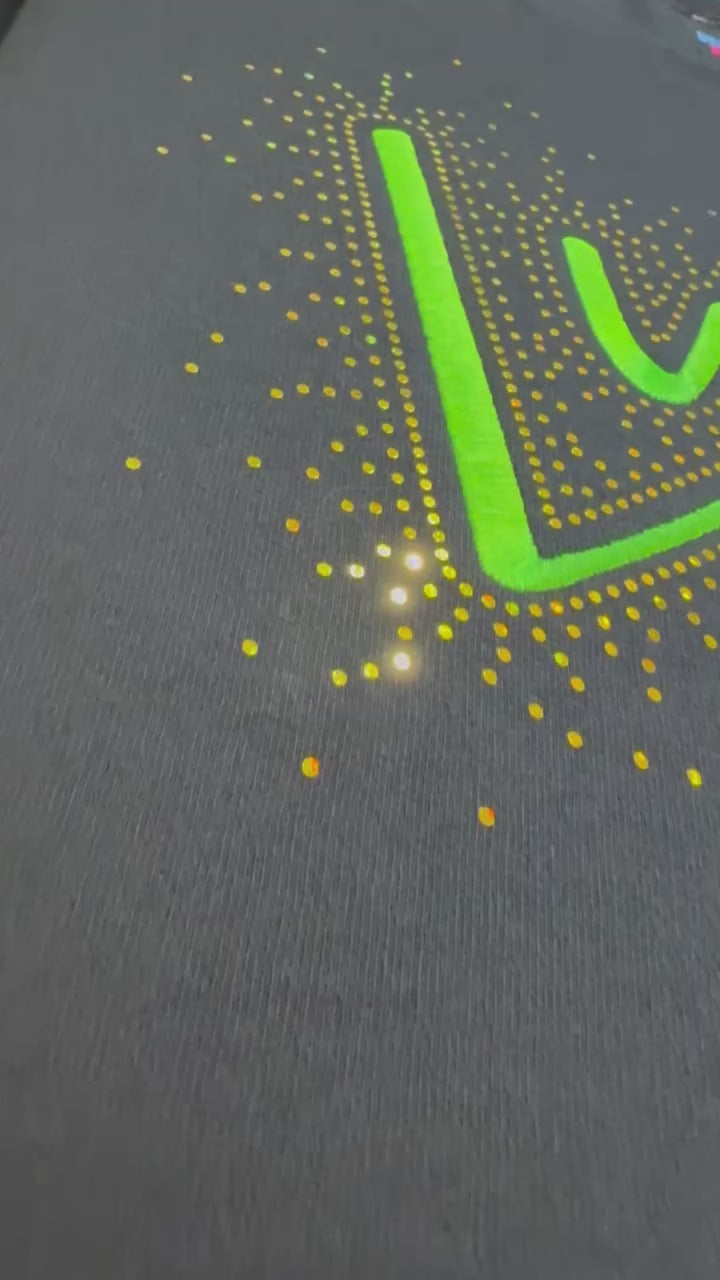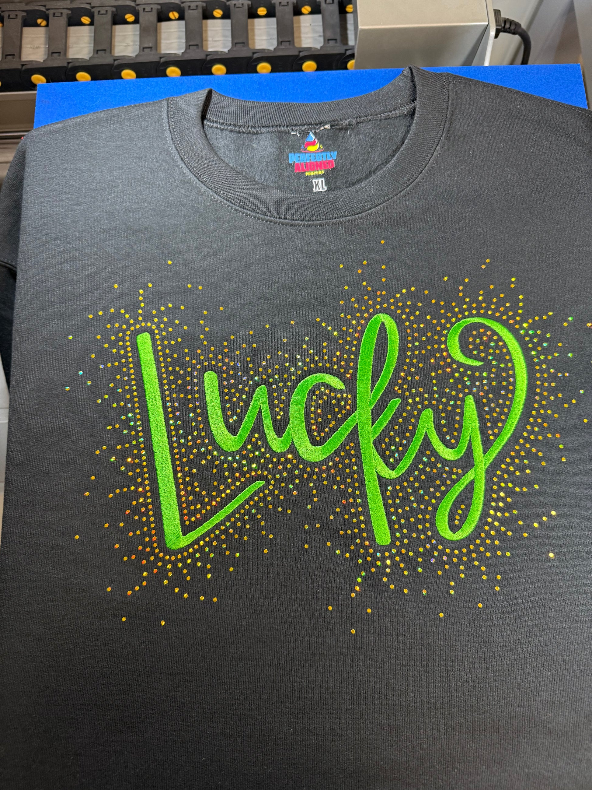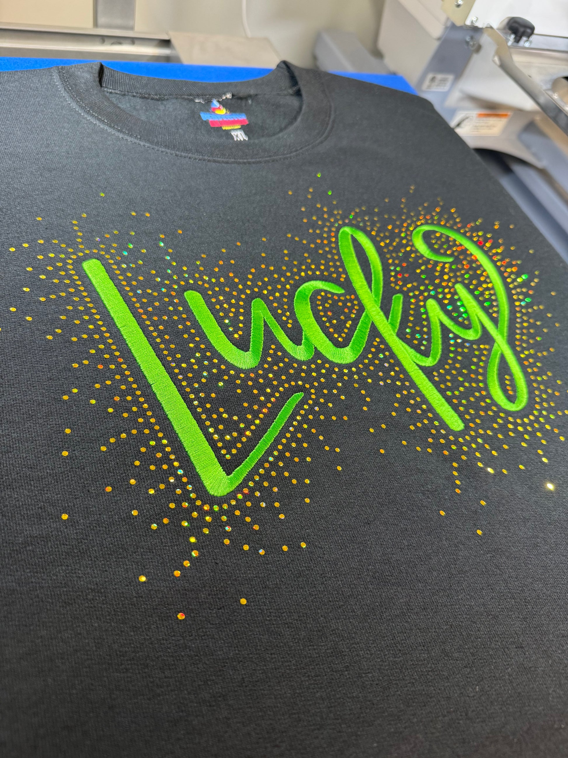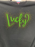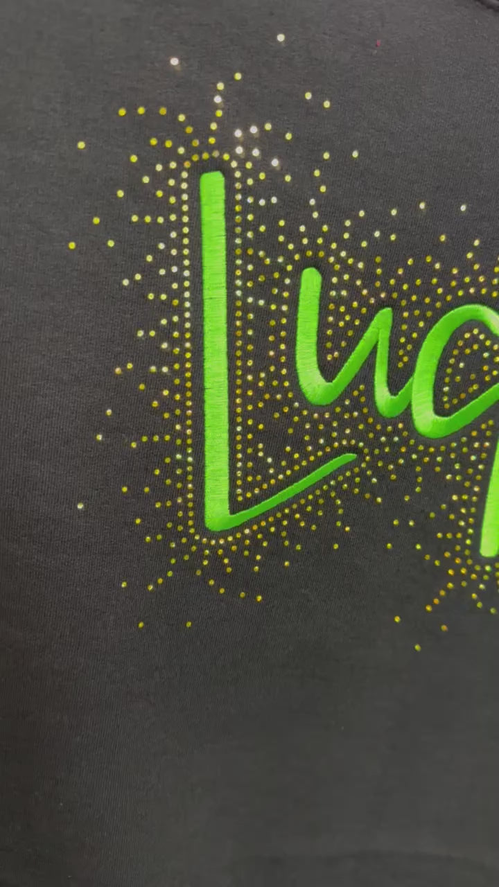 Our LUCKY Sweater or Tee brings the shimmer and the charm. Featuring an embroidered "Lucky" front and center, this design is surrounded by eye-catching spangles that deliver major sparkle. Think rhinestone vibes - but with flat, highly reflective dots that catch the light beautifully from every angle.